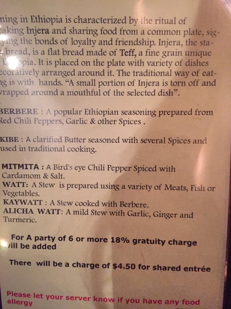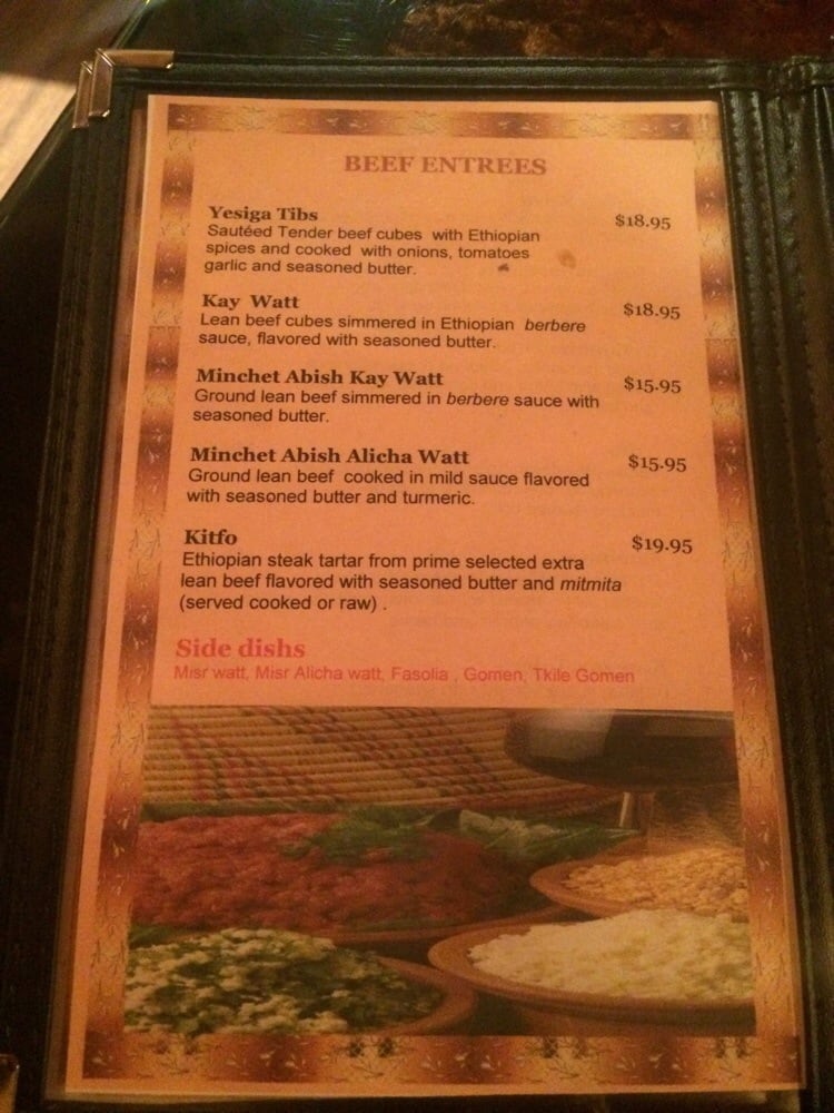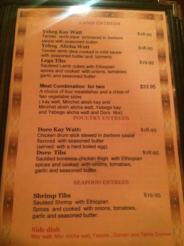A choice of meat dishes and a choice of vegetable side (kay watt, minchet abish kay and yebege kay and yebege alicha watt and doro tibs). Add shrimp tibs, yesga tbs for an additional charge.